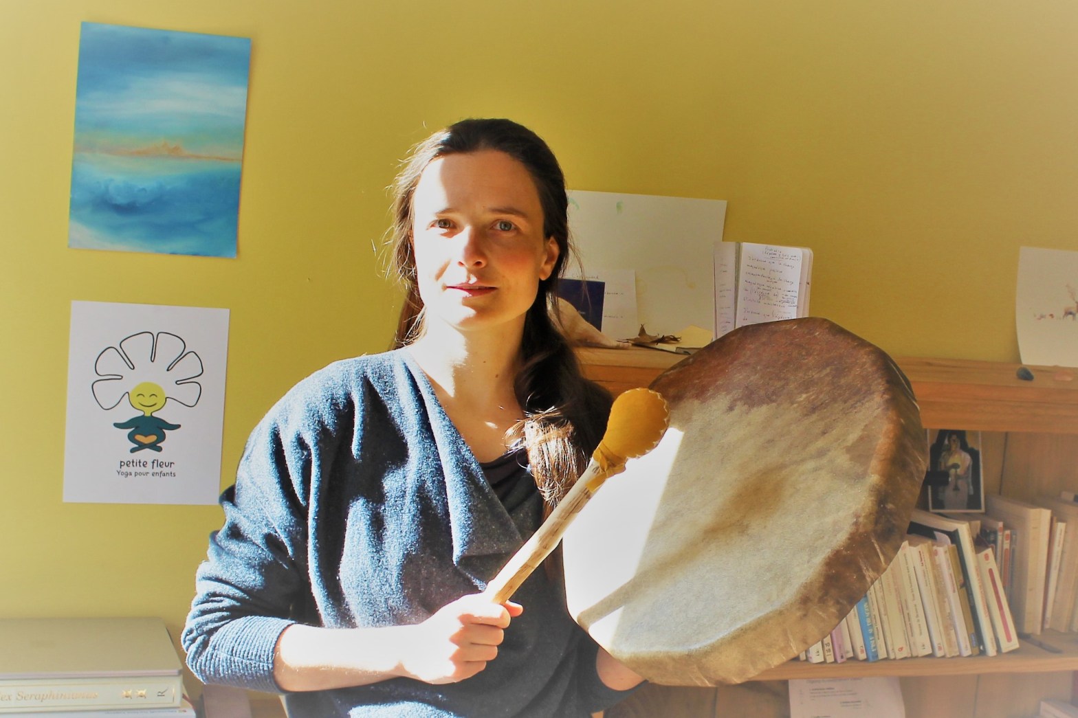 Nombreux sont les enfants âgés entre 1 et 5 ans qui adorent la musique. Tout comme la nature et les animaux, le chant et la musique les touchent beaucoup. À la fin de chacun de mes ateliers de yoga avec les enfants, nous faisons une relaxation. Une relaxation avec des enfants de 1 an? Oui, c’est possible d’amener les tout-petits à un état de concentration profonde à l’aide du chant et de la musique. Je leur joue du tambour en chantant, et soudainement, comme par magie, tout s’arrête : les enfants sont médusés, charmés et attentifs. Lorsque je suis moi-même dans un état de calme, dans mon cœur, alors les enfants me suivent naturellement. À condition, bien sûr, de les laisser libres de choisir ce qui est juste pour eux, c’est-à-dire se concentrer ou non, bouger ou non, etc.